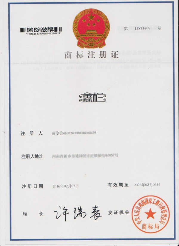恭喜!新乡鑫栏护栏厂商标证书成功注册下来!