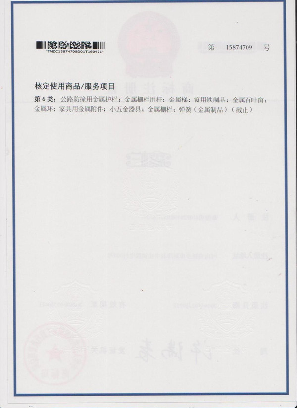 新乡鑫栏护栏厂商标证书成功注册下来,下面是商标证书: